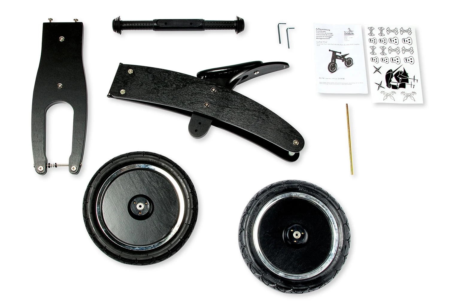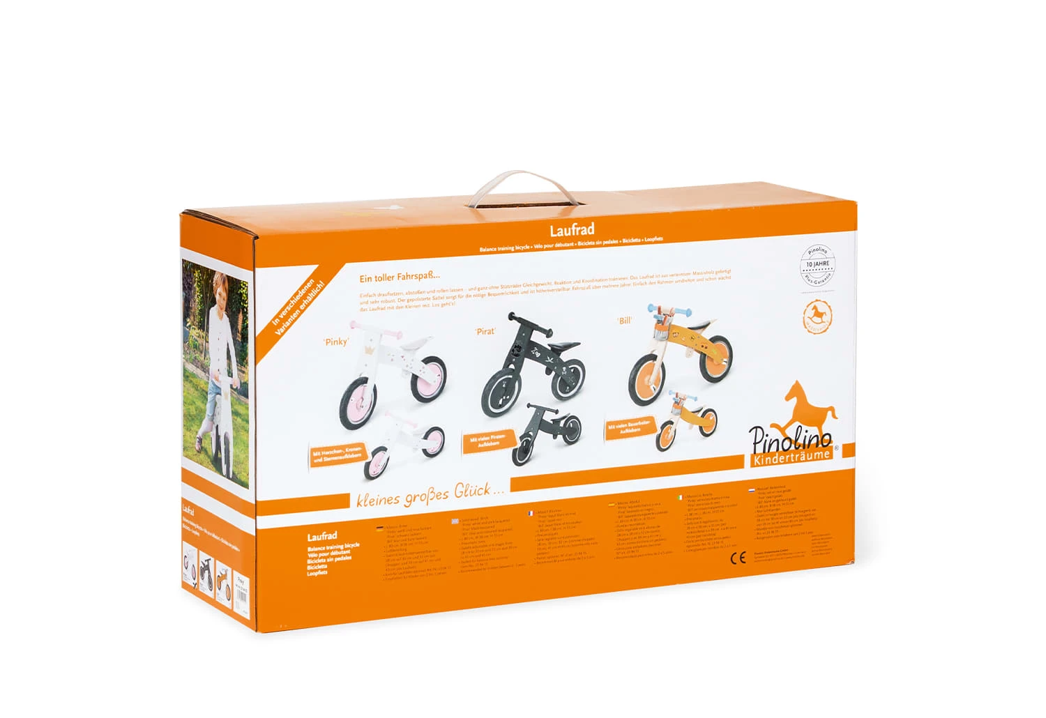 Lauflernrad ‚Pirat‘, Maße L 85 x B 38 x H 55 cm, Material: massive Birke, schwarz lackiert, Sattel 8-fach höhenverstellbar von 31 cm bis 37 cm (Chopper) und 38 cm bis 44 cm (Laufrad), Gewicht 4 kg, Montage erforderlich. Dank des gepolsterten und 8-fach höhenverstellbaren Sattels und der Umbaumöglichkeit vom Chopper zum Laufrad wird das Lauffahrrad ‚Pirat‘ zu einem fabelhaften Begleiter über viele Jahre. Für Jungs von 2 bis 5 Jahren. Die Möglichkeit, das Holzfahrrad individuell mit Segelschiff,- Kompassrosen-, Säbel- und Totenkopfaufklebern zu gestalten, macht ‚Pirat‘ zu einem echten Hingucker auf jeder Spazierfahrt. Optional ist von Pinolino ein Stellplatz für Laufräder erhältlich. Das robuste Kinderspielzeug verfügt über eine unplattbare EVA-Softbereifung, wodurch ein Aufpumpen nicht mehr notwendig ist. Das Laufrad ist eine super Geschenkidee zum Geburtstag, zur Taufe oder zu Weihnachten .Pinolino erfüllt seit 1997 Kinderträume und vertreibt Kindermöbel, Accessoires und Spielwaren. Das deutsche Unternehmen verwendet nur für Kinder geeignete Lacke, Lasuren und Öle und bietet viele FSC®-zertifizierte Produkte an.